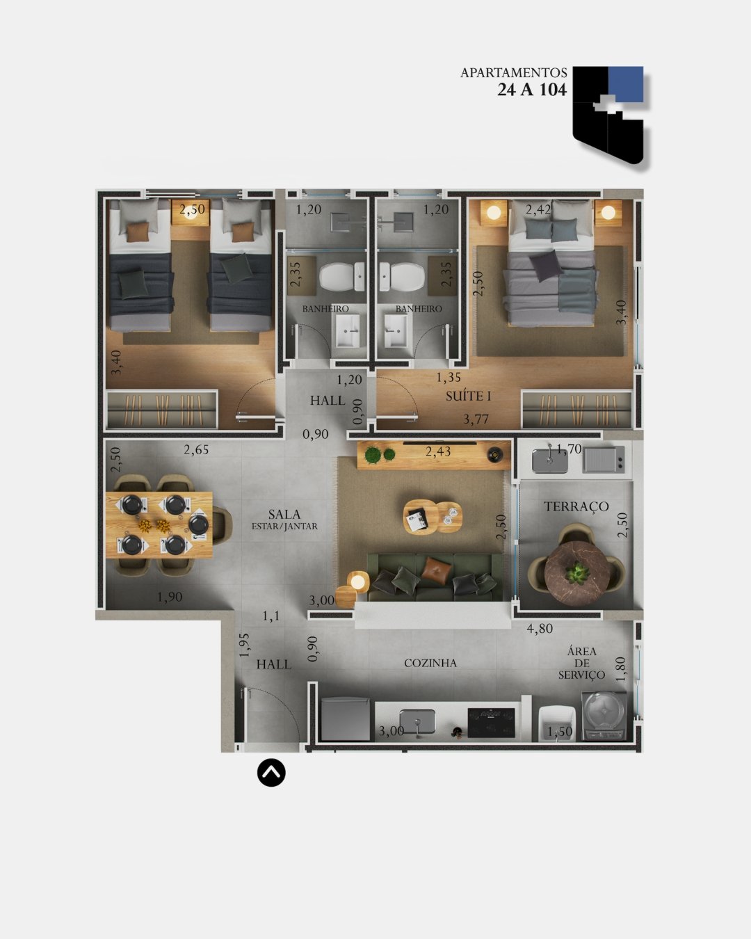 Os apartamentos são de 62 a 79m² , com dois dormitórios sendo um suite, todos com varanda gourmet e uma vaga de garagem.