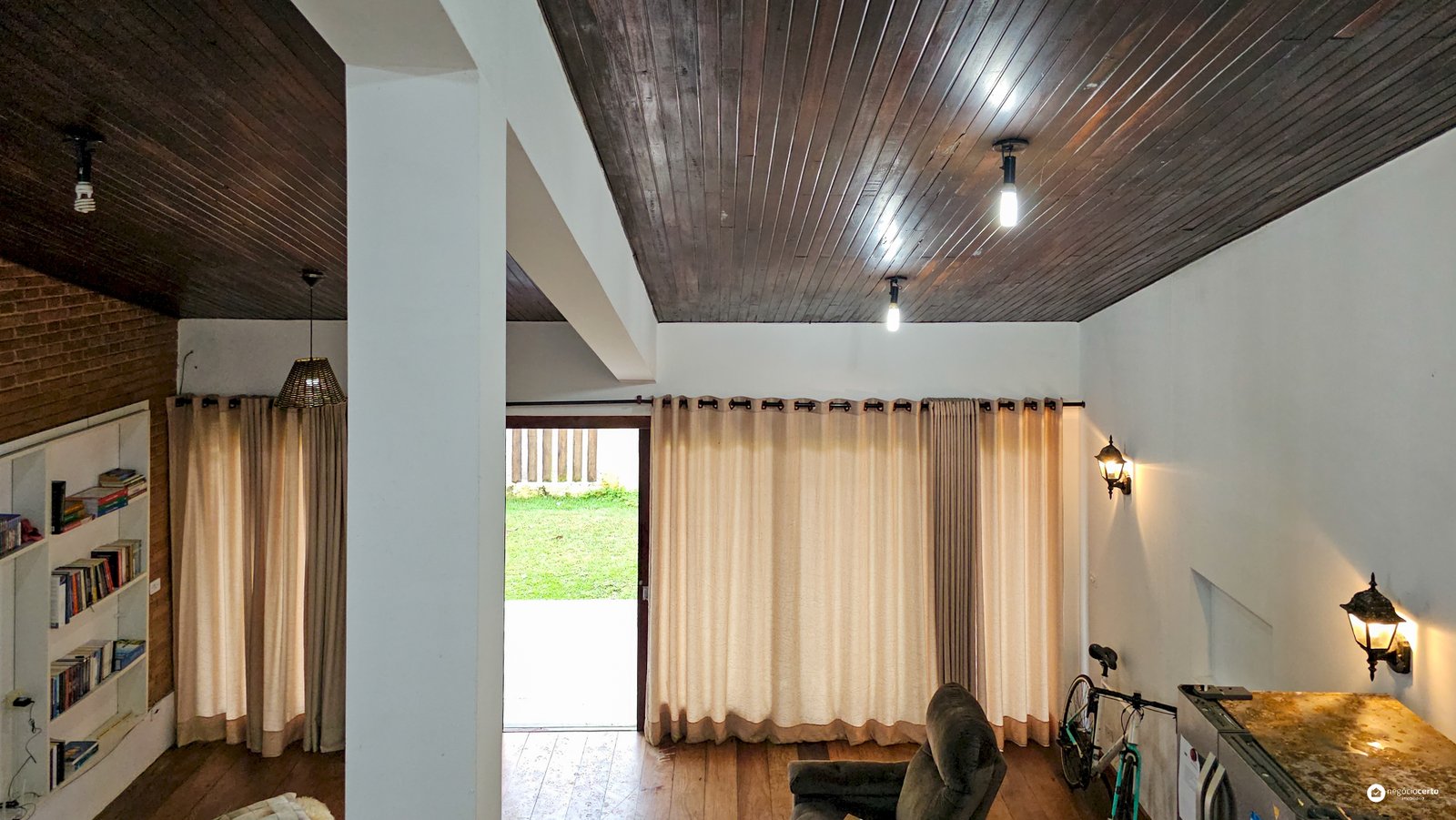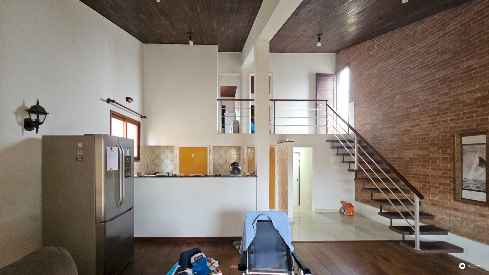 Ampla sala com piso em madeira e cozinha americana com armário embutido.